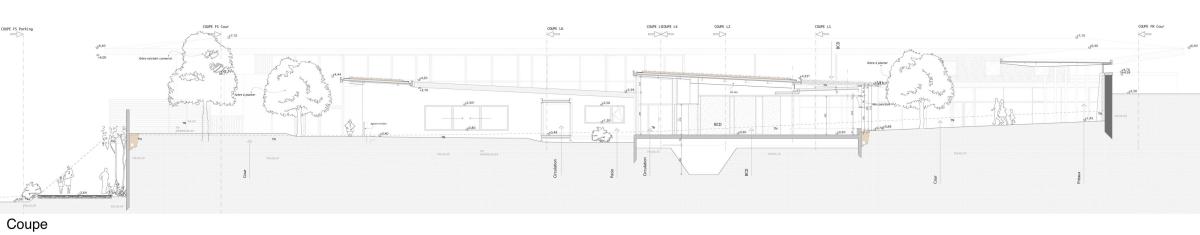 Les infléchissements en longueur de ces toitures vont à la rencontre d’un espace boisé situé sur les hauteurs du site, lieu privilégié qui a abrité les jeux de plusieurs générations d’enfants et qui appartient naturellement à l’histoire de l’école.