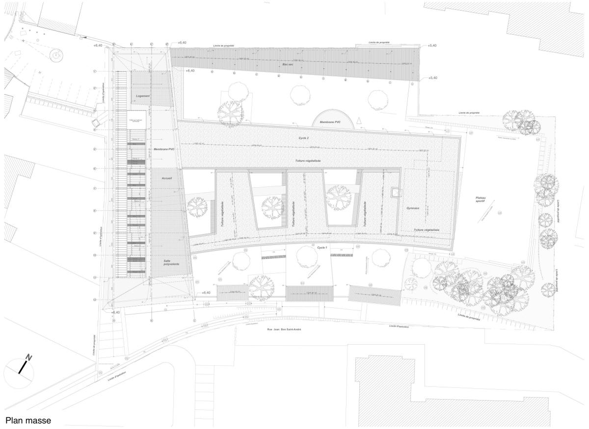 Les toitures végétalisées abritant la « maternelle » et le « primaire » prolongent le site par le jeu de leur composition formelle.