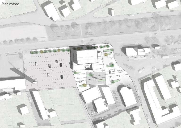 Le projet s’implante le long du boulevard dans le prolongement de l’office du tourisme afin de conforter cet alignement urbain. Cette implantation permet également de créer une place publique offrant une large place aux piétons et desservant les équipements existants alentour (la bibliothèque, la maison du temps, etc)