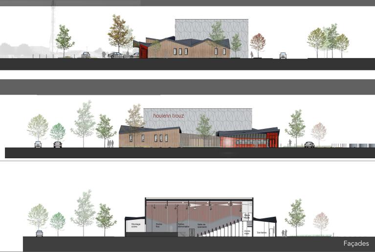 Le volume principal de la salle émerge. Ses façades en béton sont rythmées par un motif géométrique et des pixels de couleurs. Les locaux annexes plus bas bardés de bois s’enroulent autour du volume principal avec un jeux de toitures gauches caractérisant le bâtiment. L’ensemble dans des teintes de bleu associé au bois est ponctué par des pointes de rouge (le lettrage de la signalétique, l’entrée, le bar billetterie, etc).